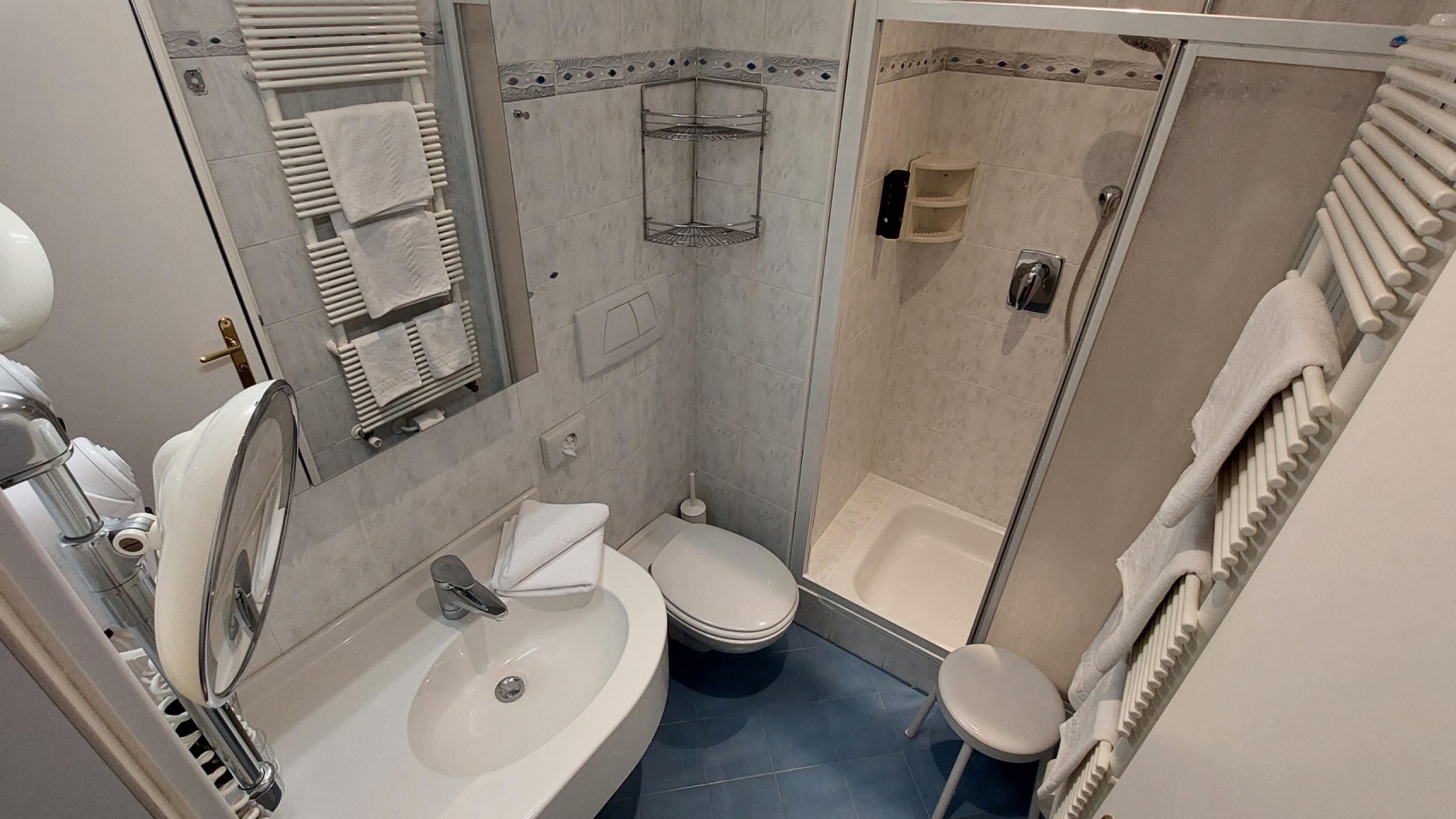 - Badezimmer mit Dusche, WC, Föhn und Kosmetikspiegel