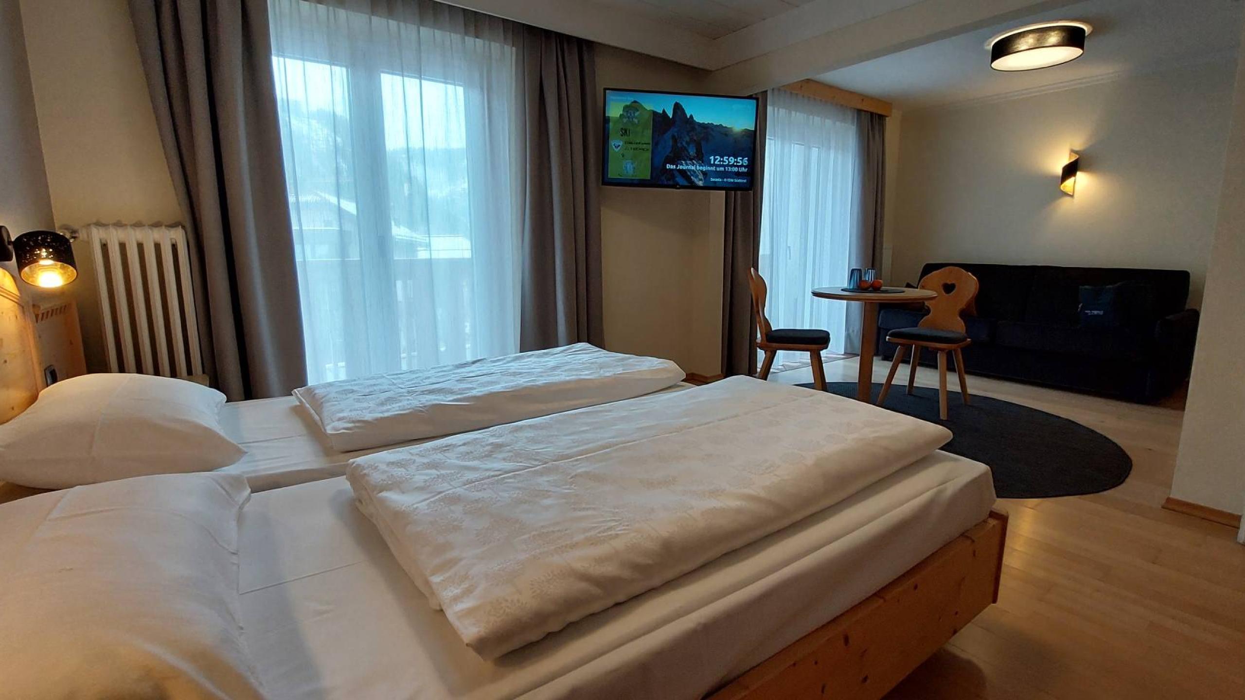 Plenty of space for your holiday wishes: Your extra-large Superior Cristallo room not only impresses indoors but also outdoors, with a fantastic view of Sassolungo/Langkofel and Monte Pana. Perfect for those who love to gaze at the deep crimson evening sky – simply breathtaking!